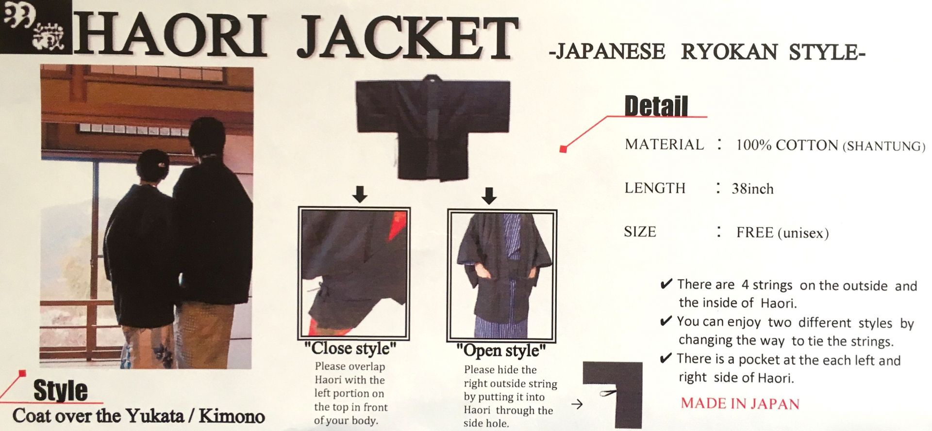 100% coton de couleur blanc et bleu marine.Le motif représente la vague japonaise.A porter pour tout événements exceptionnels.