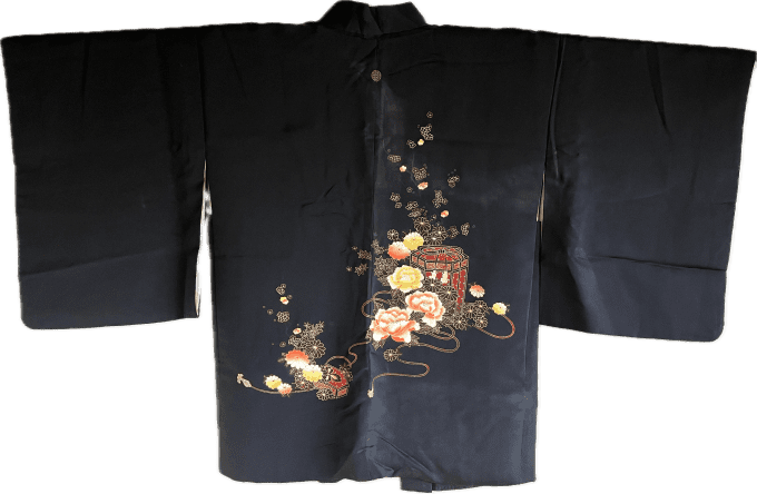 Haori femme antique soie noire -Bouquet de fleurs Kiku & Ume
