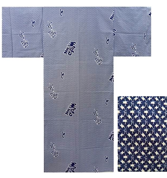100% coton,couleur bleu/blanc,motif forme géometrique et caractères japonais,kanji du mot "Hisha" (la tour,piece du jeu d'echec japonais shogi).Fabrication au Japon